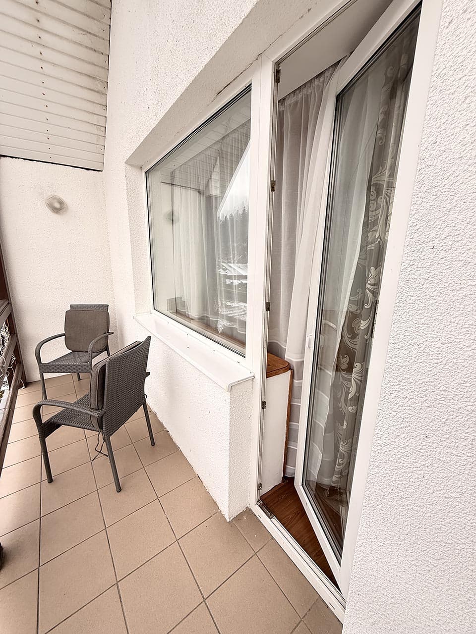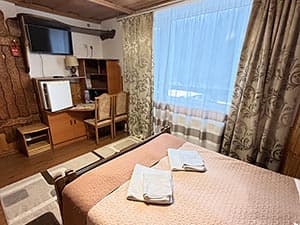 В номере: двухместная спальная кровать, шкаф, телевизор, холодильник, фен, электрочайник, удобства, балкон с видом на речку.